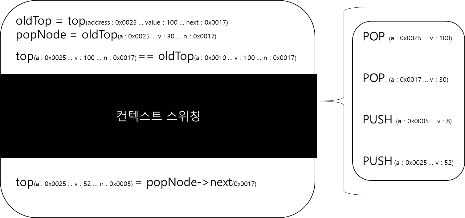 재활용된 주소가 현재의 top이 아니라면 CAS에 의해 걸러질 것이므로 CAS에 성공했다면 oldTop가 가르키는 노드의 value와 top이 가르키는 노드에 저장된 value의 일치 여부와 상관없이 newNode는 현재의 top 위에 올라가게 됨이 보장된다.