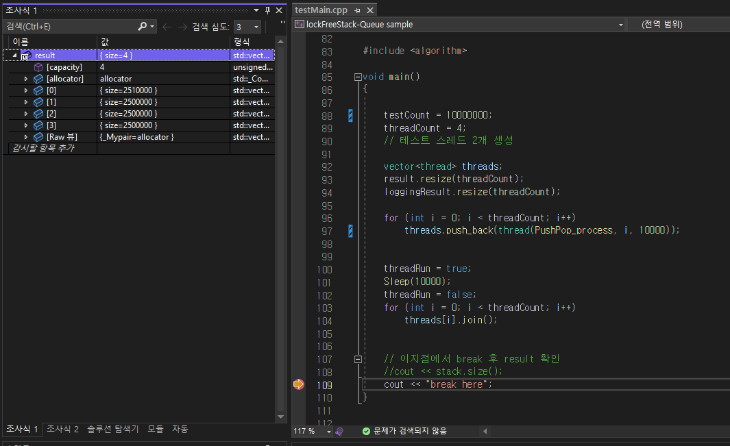 testCount를 1000만, 스레드를 4개, pushPopSize를 1만으로 세팅해도 문제없이 동작한다.