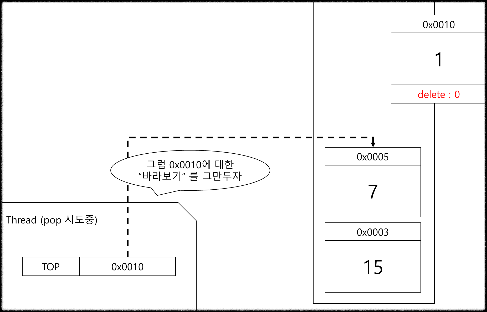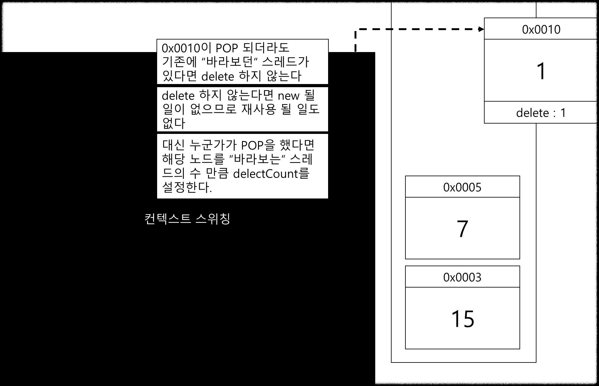 참조 카운터를 이용하는 방법은 임의의 노드를 바라보는 스레드의 개수를 이용하여 아무도 해당 노드를 참조하지 않을 때 delete를 하는 방식이다. 누군가 참조를 하고 있다면 delete 되지 않기 때문에 바라보던 노드의 주소가 재사용되어 ABA 문제가 발생할 여지를 두지 않는다. 주의할 점은 노드의 삽입시점에서 stack이 삽입된 노드를 참조하는 값을 1 두어야 하고 POP에 성공한 스레드가 있다면 해당 스레드의 참조 제거와 함께 stack이 참조하고 있던 카운터도 한 개 더 제거해 주어야 한다는 것이다.
