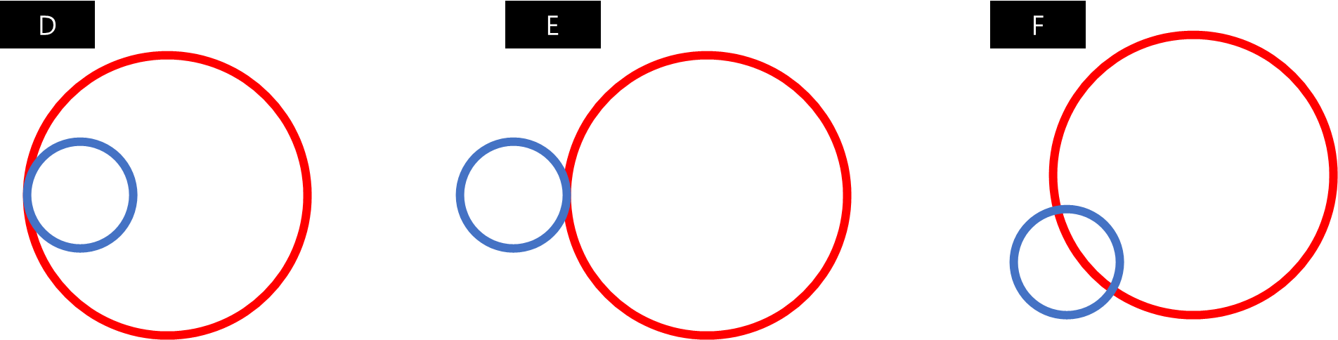 E 상황은 중심좌표가 다르고, [두 원의 중심간 거리 = 큰 원의 반지름 + 작은 원의 반지름 ] 인 경우