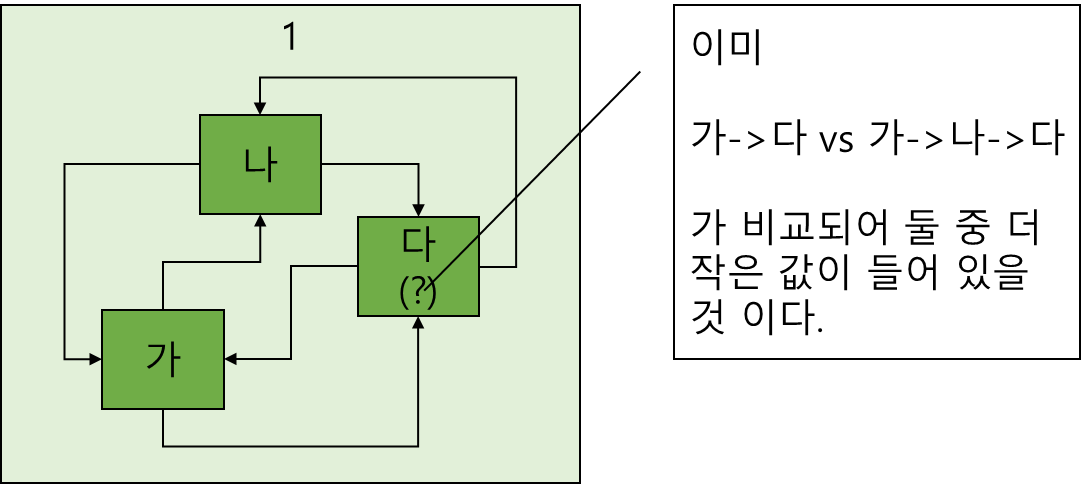 하지만 다시 생각해보면 [가], [나], [다] 노드는 탐색이 완료된 노드들이다. 즉 [다] 노드에는 이미 [가]->[나]->[다]가 적합한지, [가]->[다]가 적합한지 비교가 된 채로 최소 가중치가 이미 들어 있는 것이다.