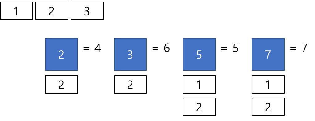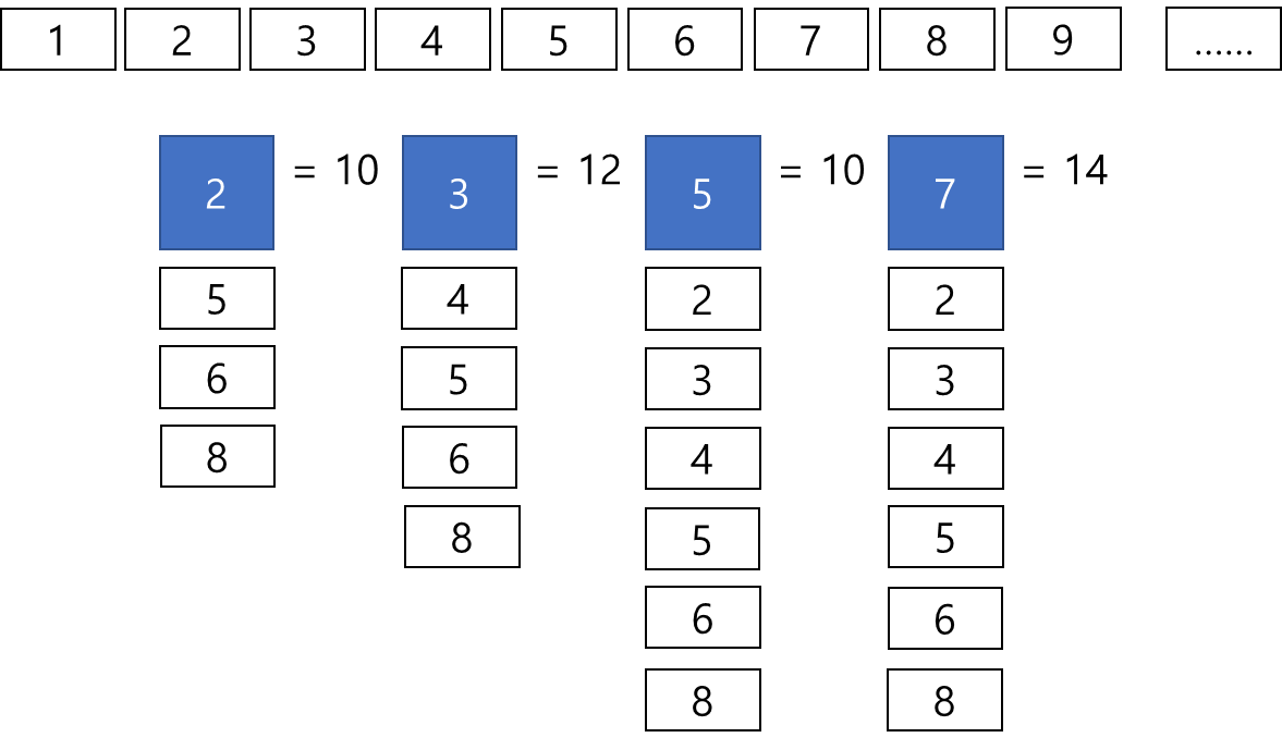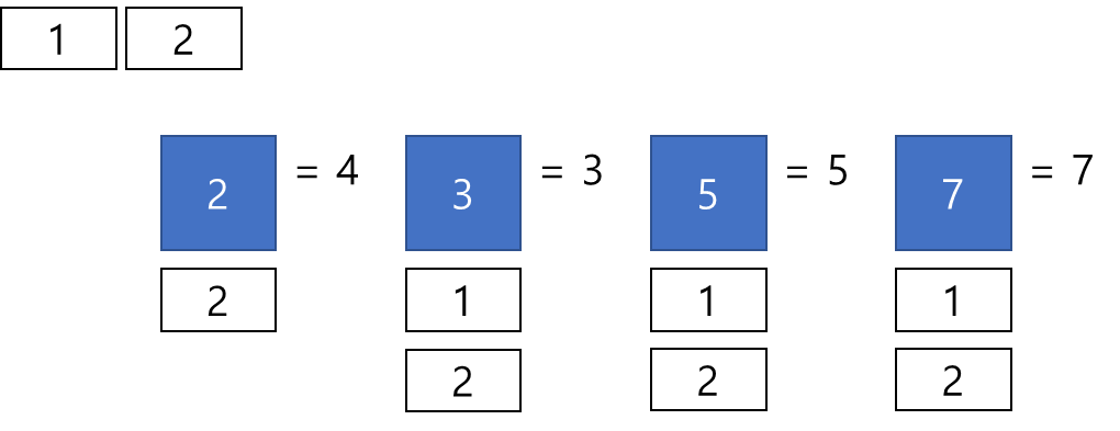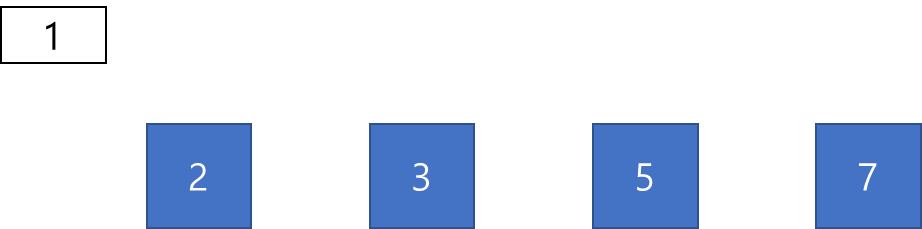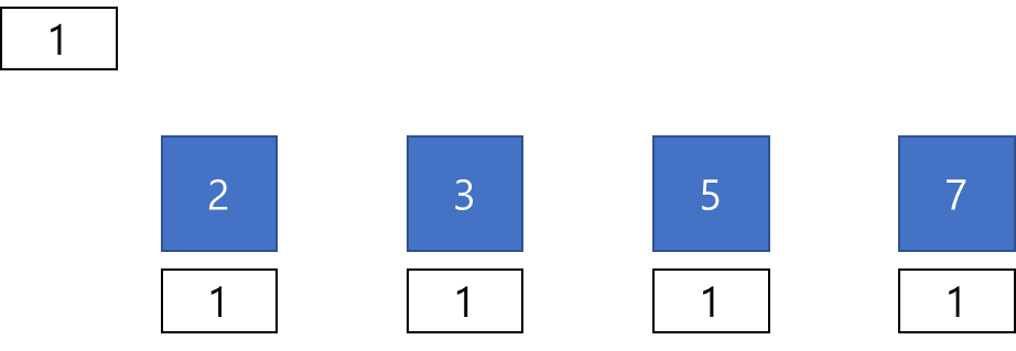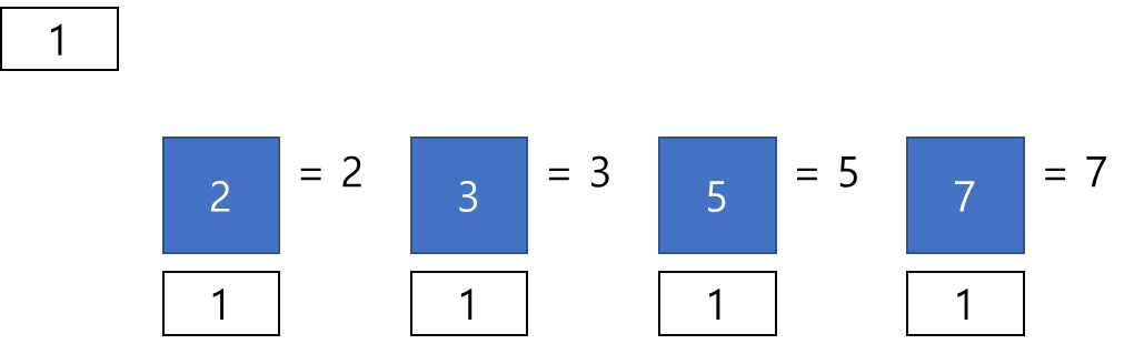 파란 사각형은 입력으로 주어진 소수들을 의미하고, 파란 사각형 밑에 붙을 흰색 작은 사각형은 각 소수의 연산 대상이라고 생각하면 된다. 자세한 내용은 아래에 기술한다.