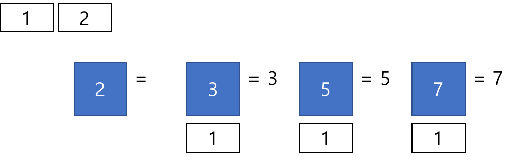 파란 사각형은 입력으로 주어진 소수들을 의미하고, 파란 사각형 밑에 붙을 흰색 작은 사각형은 각 소수의 연산 대상이라고 생각하면 된다. 자세한 내용은 아래에 기술한다.