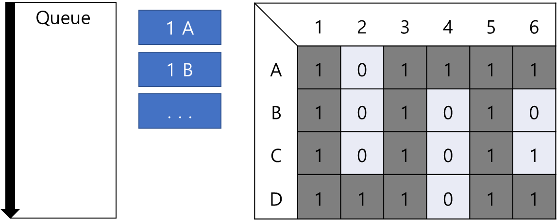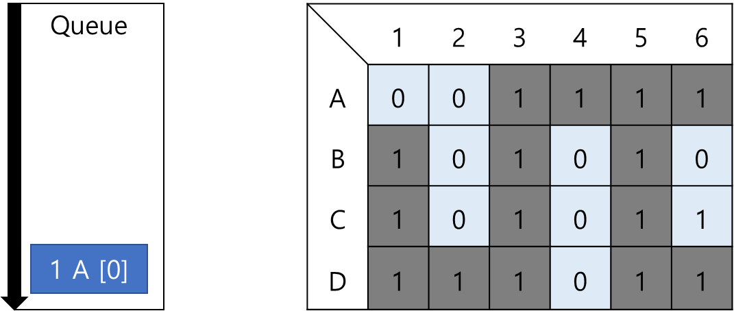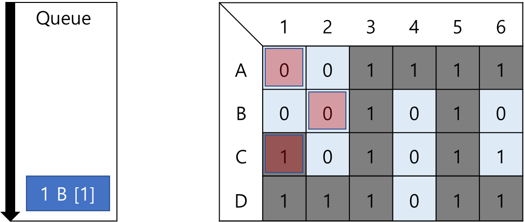 - (규칙 B) 큐가 완전히 비거나 (도달 불가능) / 목적지에 도착할 때까지 (규칙 A)를 반복한다.