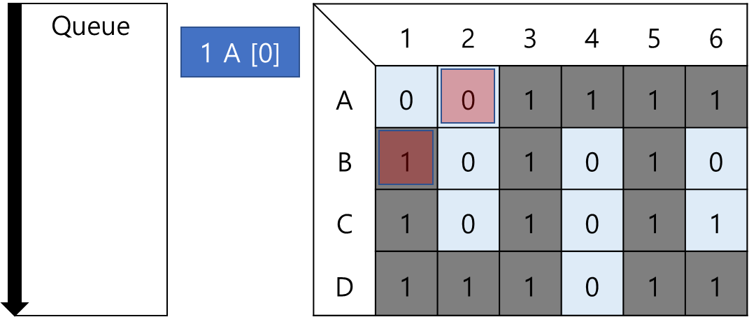 큐에 1, B를 넣어줄 때, 기존의 걸음수인 0에서 1을 더한 값을 같이 넣어 큐에 저장한다. 또한 중복을 방지하기 위하여 새로 넣어지는 좌표 칸의 값을 이동 불가능하게 (= 0으로) 바꾸어준다.