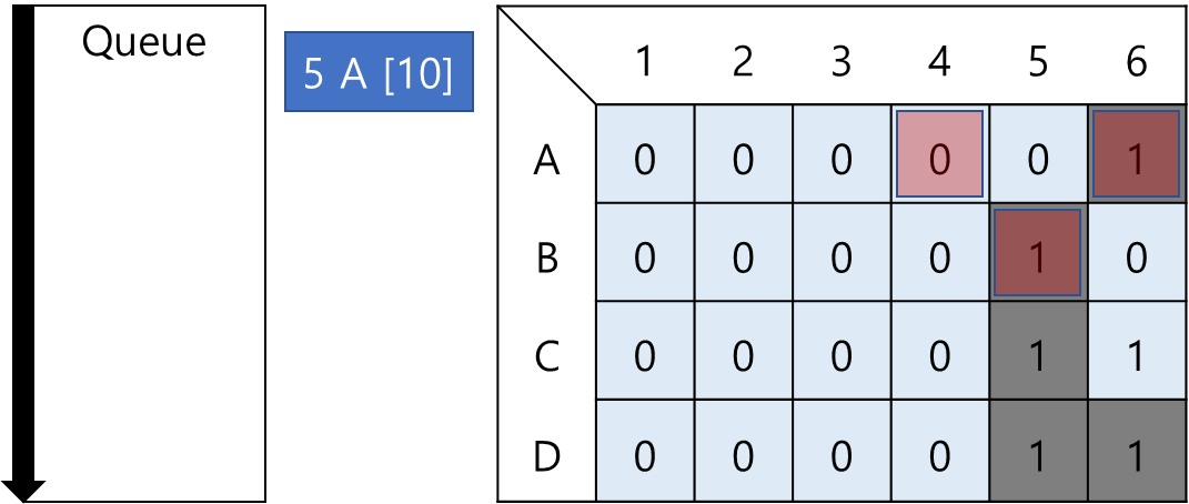 물론 (6, A, [11])에서 더 이상 이동 가능한 공간이 없기 때문에 자연스럽게 삭제가 되며 목적지인 6, D로 이동하여 14라는 거리를 얻을 수 있다.