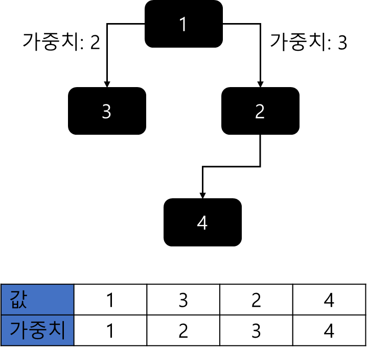 단 이때 2개 이상의 노드를 자식으로 갖는 경우 가중치가 낮을수록 왼쪽에 위치하도록 구성한다.
