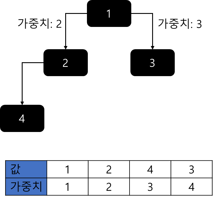 단 이때 2개 이상의 노드를 자식으로 갖는 경우 가중치가 낮을수록 왼쪽에 위치하도록 구성한다.