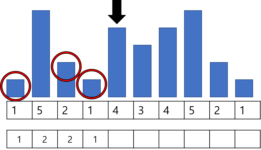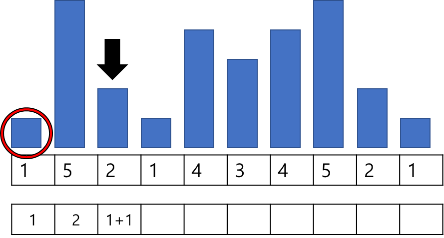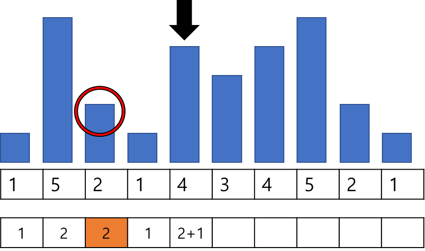 계속하여 탐색을 진행하고, 앞선 인덱스 중에 2보다 작은 값은 1 밖에 없으므로 1+1인 2가 저장된다.
