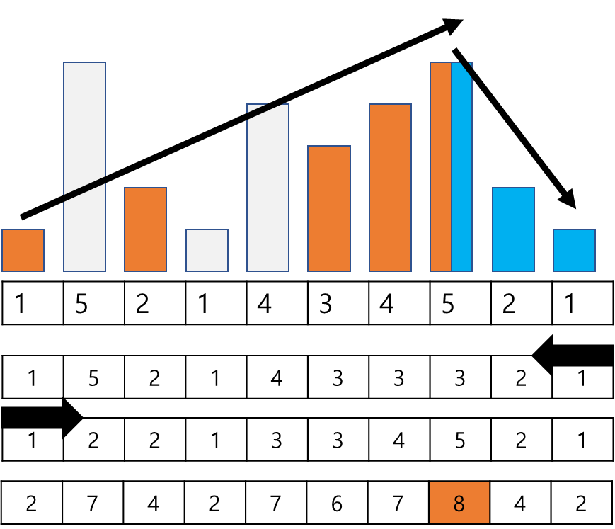 문제를 풀기 위해서는 증가하는 부분 수열과, 감소하는 부분 수열을 각각 계산하여 합하는 것이 가장 간단해 보였다.