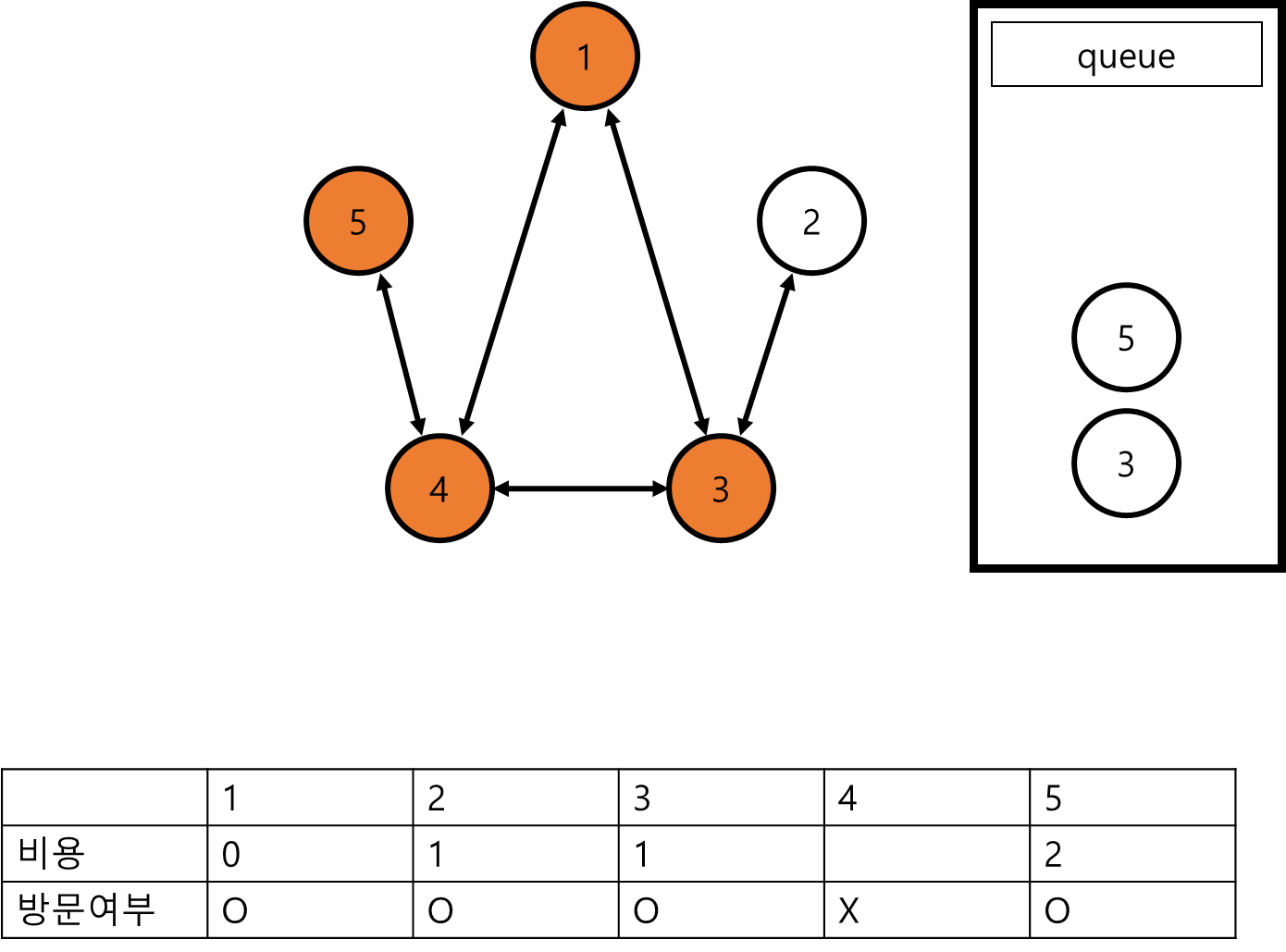 5번 노드의 비용과 방문 여부를 갱신한 이후 큐에 넣어준다.