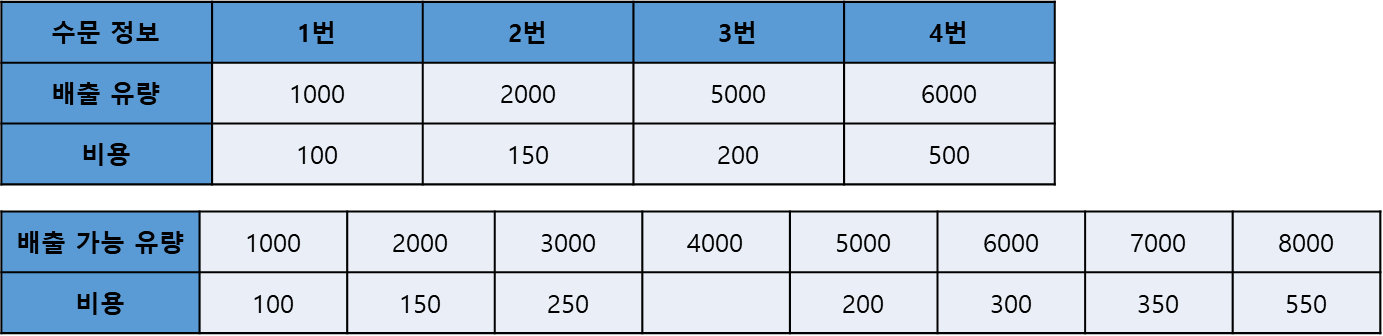 각 수문의 유랑과 비용을 이용해, 조합 가능한 유량의 최소비용을 테이블에 저장하여 풀 수 있는 문제였다. 다만 약간의 함정이 2곳에 있었다.