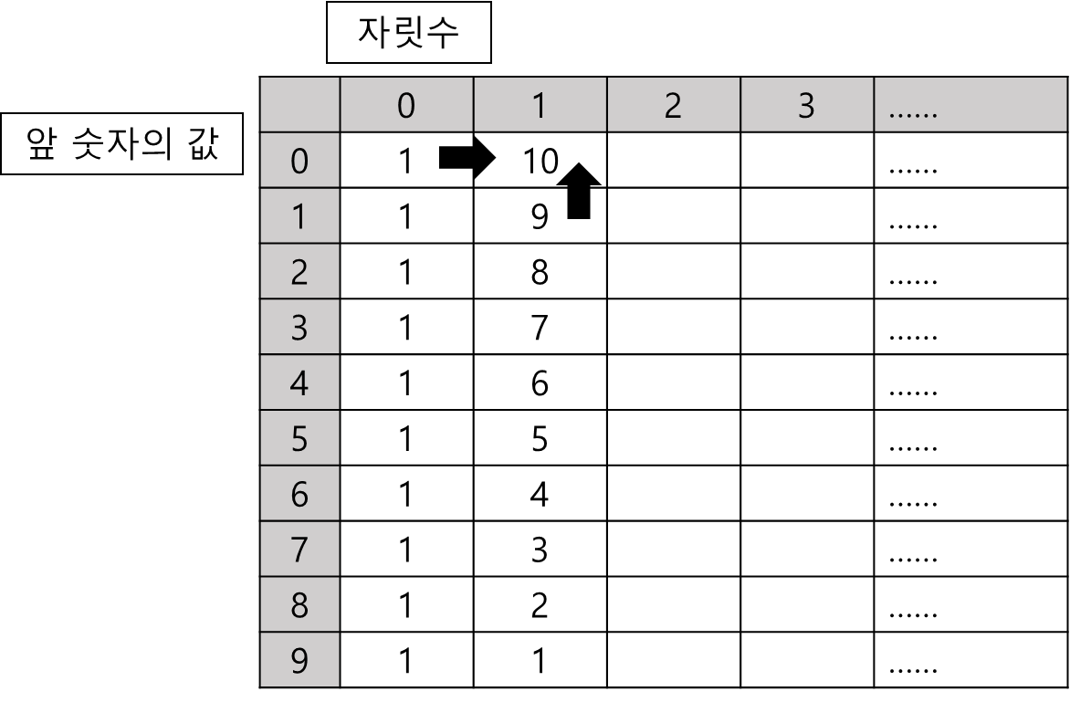 즉 앞의 숫자가 1일 경우, 뒤에 올 수 있는 숫자는 1~9 사이의 값이며