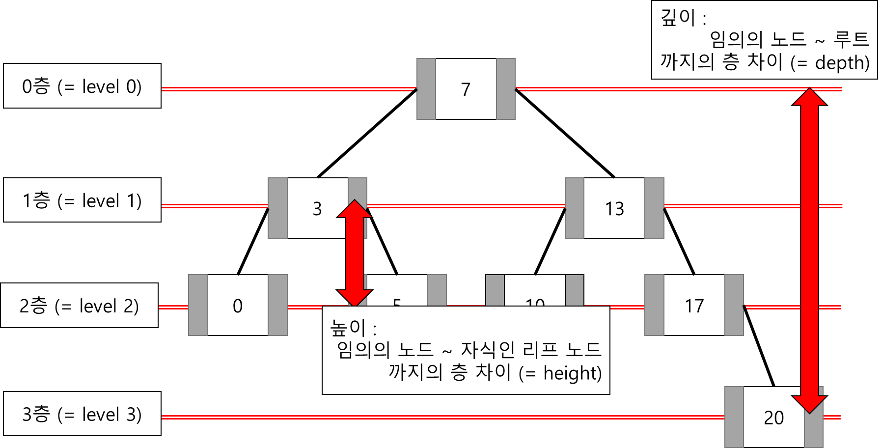 - 깊이 (depth) : 해당 노드에서부터 루트까지의 층 차이를 말한다. 아래의 예시에서 20번 노드의 깊이는 3이다.