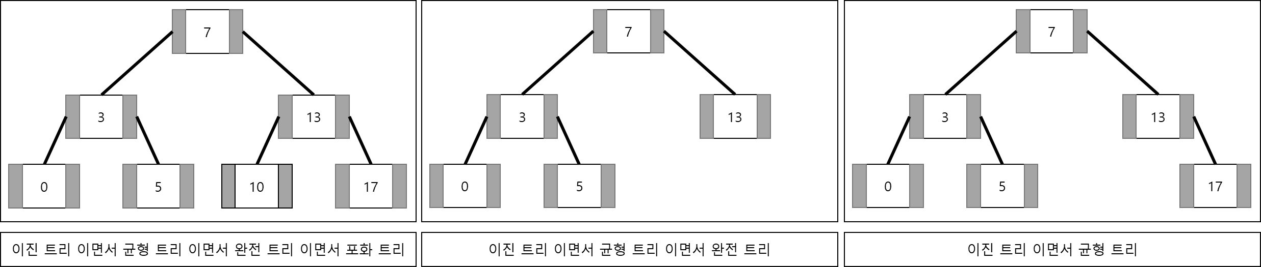 - 균형 트리 : 임의의 노드에서 좌, 우측 자식의 서브 트리의 높이( = height = 서브 트리의 층 수 + 1) 차이가 1 이하인 상태