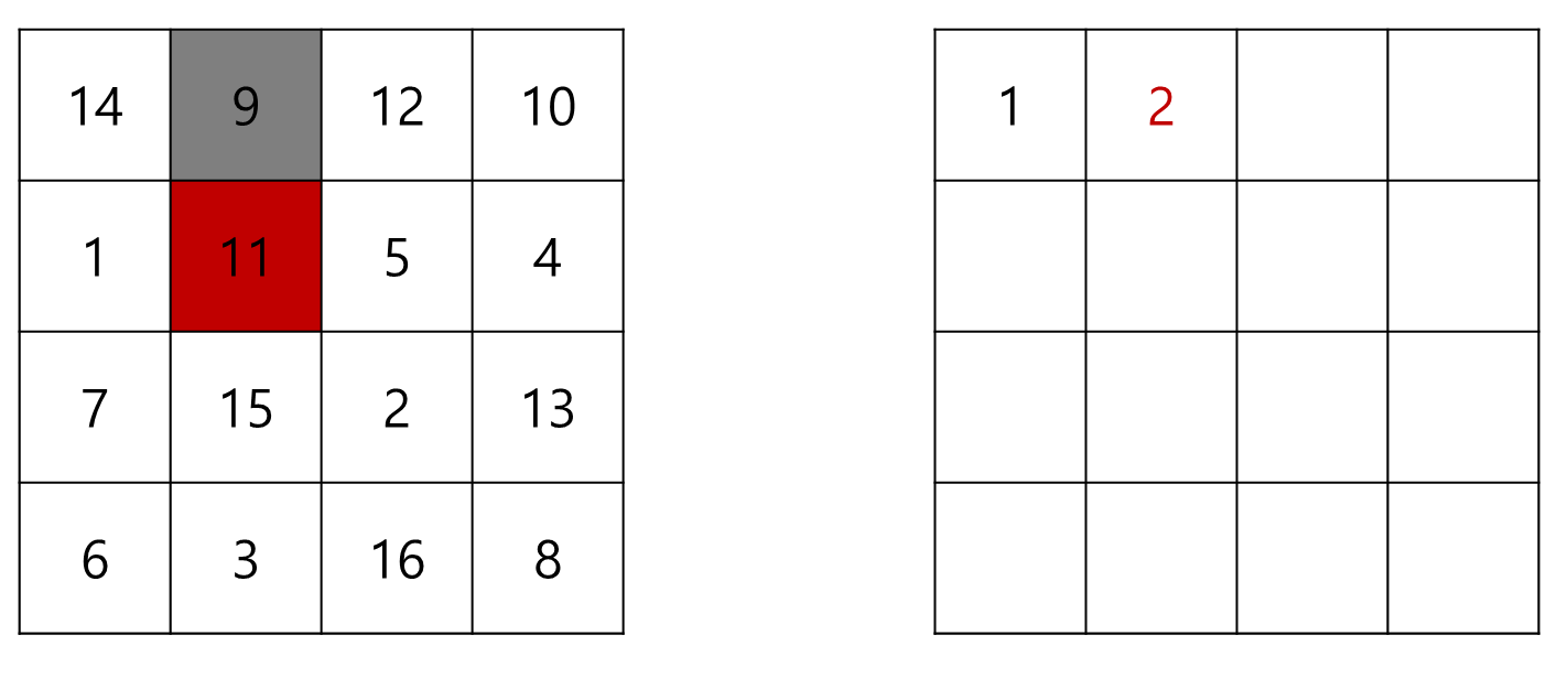 그런데 9 지점에서는 14로만 갈 수 있는 것은 아니다. 11방향으로 탐색을 진행하면 15까지 총 3칸을 올 수 있다.