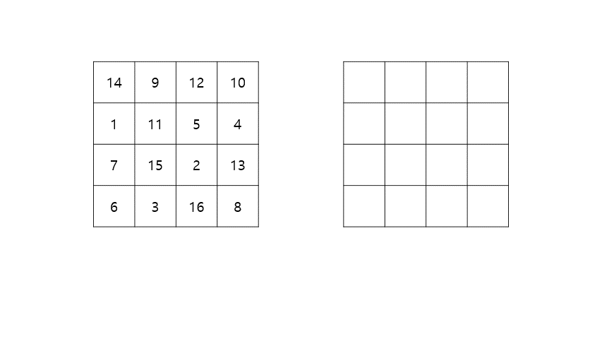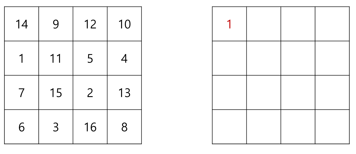 (규칙 A)에 의해 탐색을 시작하지만, 바로 끝나버린다. (= 인접한 칸 중 14보다 더 큰 값이 없음) (규칙 C)에 의해 종료 값은 1이 되며 (규칙 D)에 의해 시작 지점까지 돌아가며 종료 값을 하나씩 증가시켜 넣어주어야 하지만, 시작 지점 = 끝 지점이므로 그대로 1을 넣고 끝낸다.