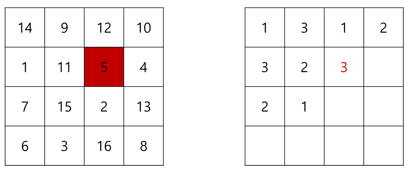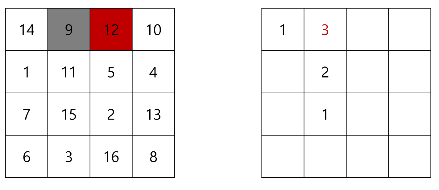 14가 더 크기 때문에 탐색이 가능하다. 하지만 (규칙 B)에 의해 이미 탐색된 값은 그 시점에서 탐색을 멈춘다. 종료 값은 1이 되고, 한 칸 뒤로 돌아온 9 지점에서는 종료 값이 2가 된다. (1씩 늘어난다)