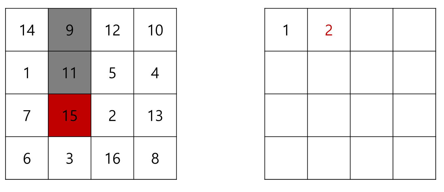 (규칙 A)에 의해 탐색을 시작하지만, 바로 끝나버린다. (= 인접한 칸 중 14보다 더 큰 값이 없음) (규칙 C)에 의해 종료 값은 1이 되며 (규칙 D)에 의해 시작 지점까지 돌아가며 종료 값을 하나씩 증가시켜 넣어주어야 하지만, 시작 지점 = 끝 지점이므로 그대로 1을 넣고 끝낸다.