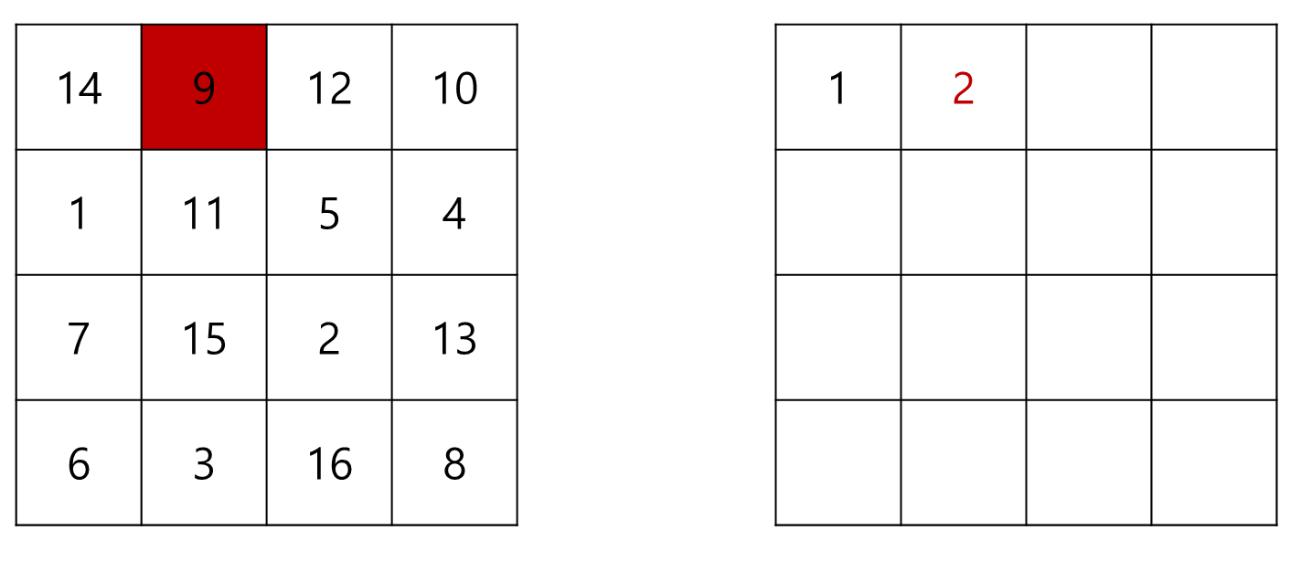 14가 더 크기 때문에 탐색이 가능하다. 하지만 (규칙 B)에 의해 이미 탐색된 값은 그 시점에서 탐색을 멈춘다. 종료 값은 1이 되고, 한 칸 뒤로 돌아온 9 지점에서는 종료 값이 2가 된다. (1씩 늘어난다)
